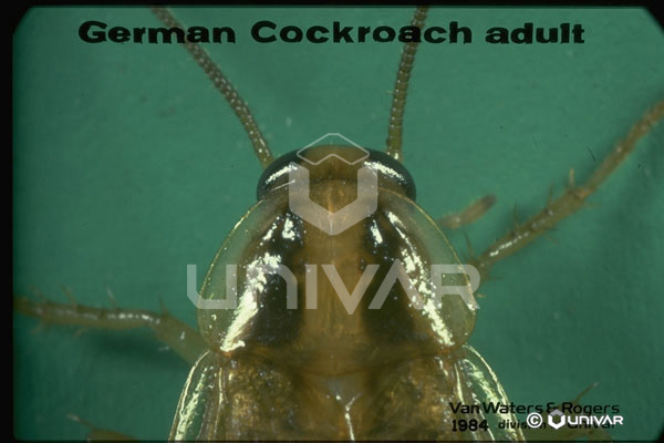 Identification: The German roach is typical of the genus Blattella, with a tan to brownish color, small size, and two dark, longitudinal stripes on its prothorax. Adults reach about ½ inch in length, with wings that reach the end of the abdomen in females and just beyond the tip of the abdomen in males. Neither is capable of flight. Nymphs begin as extremely small insects and without any hint of wings. However, they do have dark markings on the prothorax. This species may be distinguished from the Field roach by the color of the face, which is light brown in the German.
