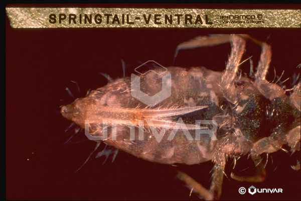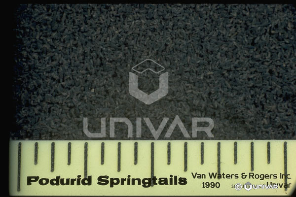 Biology: Springtails are tiny insects that occur most often in damp locations, where they feed on algae, fungi, and decaying plant materials. They become active in early spring and may be seen on snow cover, where they derive their mistaken identity as snow “fleas”. In structures their presence may indicate excessive moisture conditions in walls or crawl spaces, under sinks, or around indoor plants. They appear to be drawn to water, and commonly will appear in vast numbers on the surface of swimming pools, seemingly overnight. The name “springtail” is given due to a sharp projection at the tail end, called a furcula, which may be snapped down onto the surface they are on to allow them to spring into the air for sudden movement. This can be felt if it occurs on human skin, giving the impression that a person was just bitten by something that cannot be seen. In reality, springtails are completely harmless to humans, although allergies and dermatitis have been reported in some people sensitive to their presence.