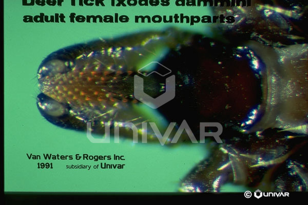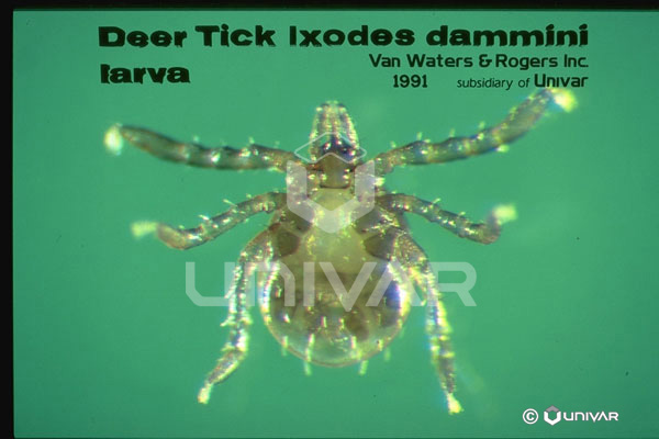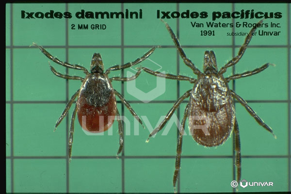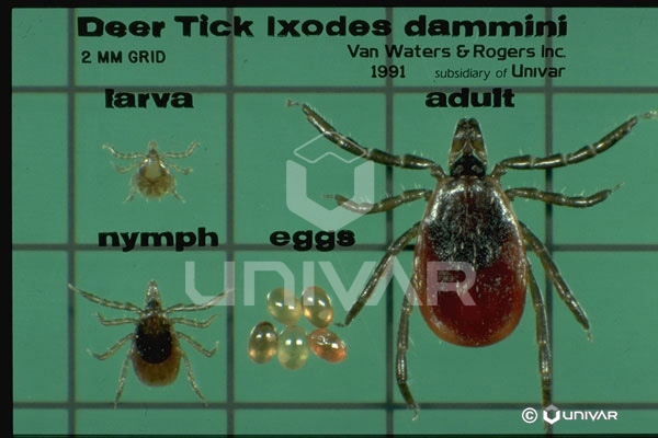Biology: Hard ticks, in general, have a two-year life cycle, with eggs hatching to the 6-legged larva in the spring, these progressing to the second instar nymph stage which overwinters, and these progressing the following year to the adult tick. There is usually a single blood meal at each stage, with the tick remaining attached for several days to over a week. After fertilization by the male, and a blood meal, the female hard tick produces a single batch of up to several thousand eggs, and then she dies. These eggs are usually placed into a secluded crevice of some sort, and this may be within a structure. The engorged, gravid female becomes bloated to many times her original size. Ixodes ticks are the main vector of Lyme Disease and Ehrlichiosis throughout the United States. The bacteria that causes the disease is not present in the eggs, and the tick must become infected by feeding on an infected host. The larvae and nymphs may be more likely to feed on smaller, ground dwelling animals such as lizards or mice, and the adults on larger animals such as deer or dogs. As these ticks feed their saliva cements them to the skin of the host, making removal very difficult.